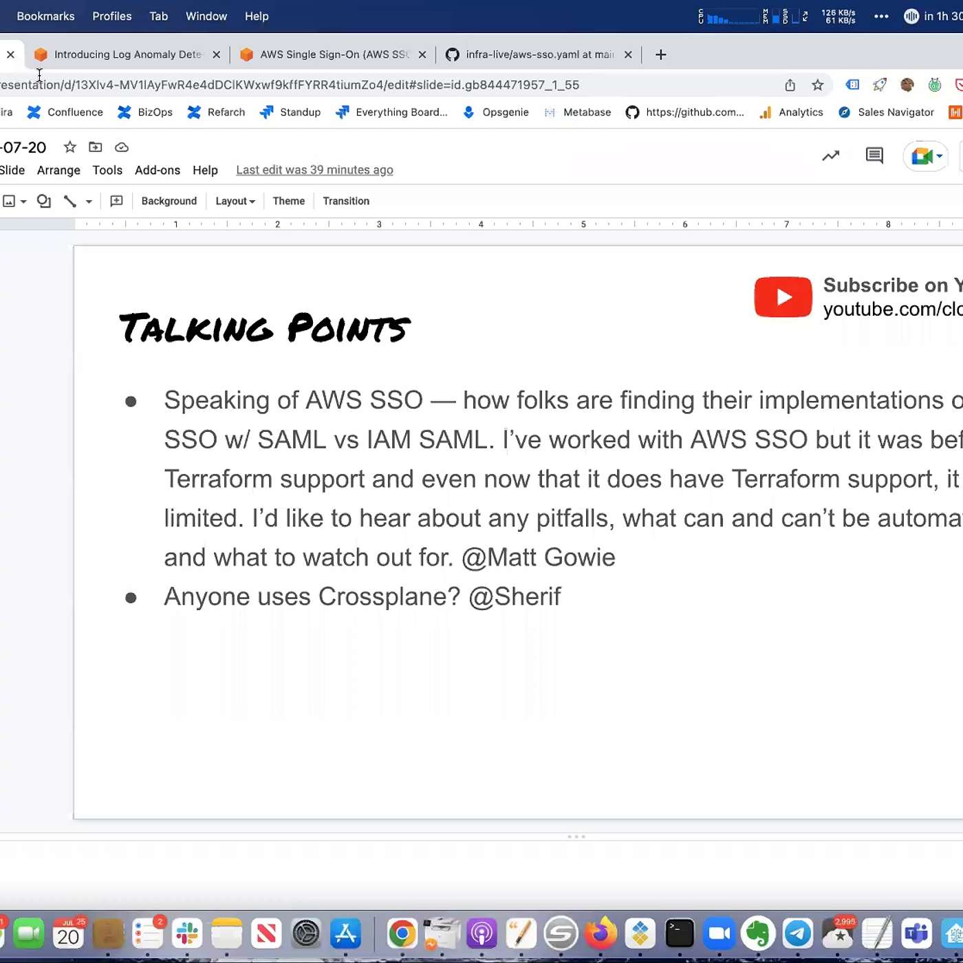 [00:06:33] Speaking of AWS SSO — how folks are finding their implementations of AWS SSO w/ SAML vs IAM SAML. I’ve worked with AWS SSO but it was before it had Terraform support and even now that it does have Terraform support, it seems limited. I’d like to hear about any pitfalls, what can and can’t be automated today, and what to watch out for. @Matt Gowie